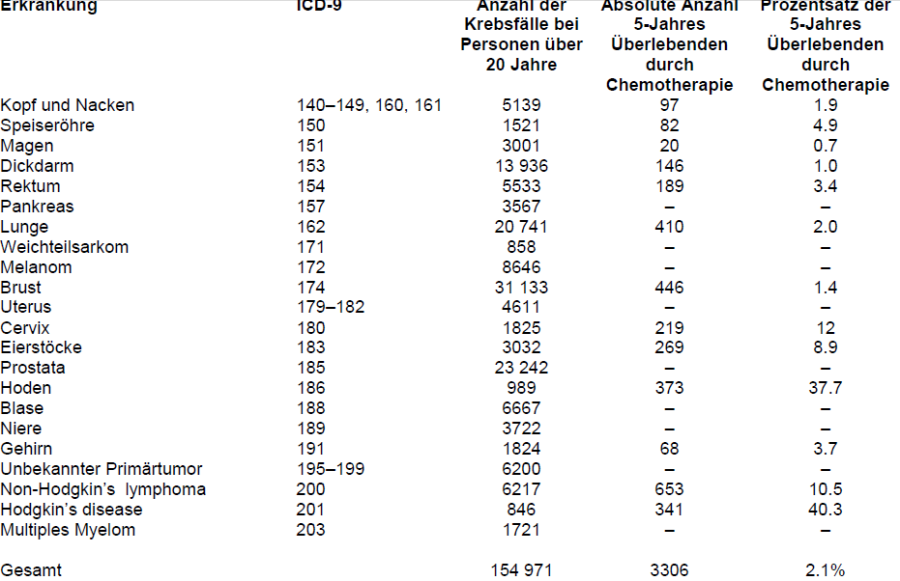 Wir wussten zu diesem Zeitpunkt, dass eine Auswertung der Daten von über 200.000 Krebspatienten in den USA und Australien (im Zeitraum 1990 bis 2004) ein für den Patienten schwieriges Ergebnis ergab, denn Chemotherapie allein schien keine guten Prognosen zu geben. Es wurden 72.946 Krebspatienten in Australien und 154.971 Krebspatienten in den Vereinigten Staaten untersucht. Man stellte fest, dass Chemotherapie insgesamt nur bei 2,3 (Australien) bzw. 2,1% (USA) aller Krebs-Patienten einen Erfolg brachte (Erfolg = 5 Jahre Überlebenszeit)